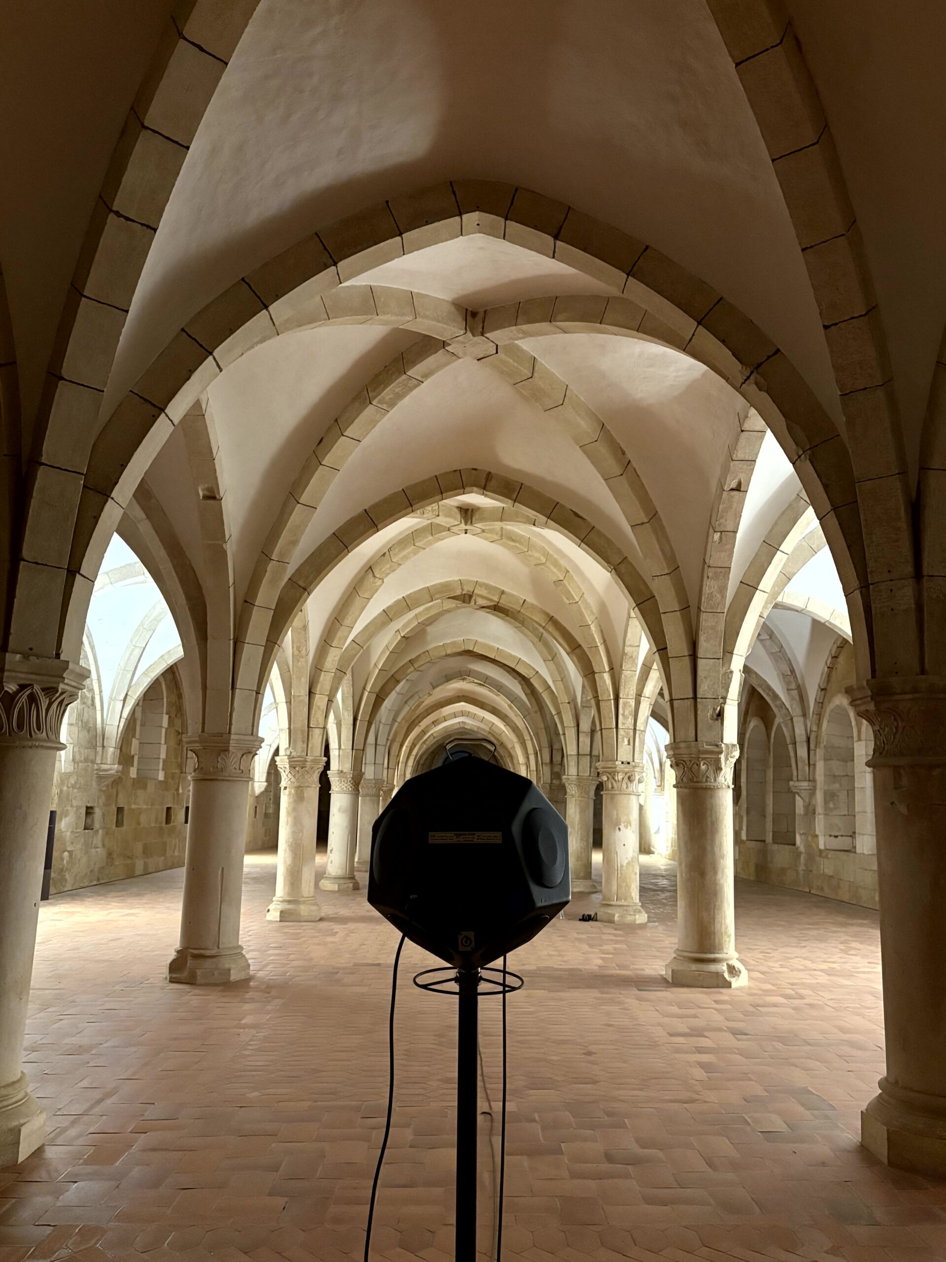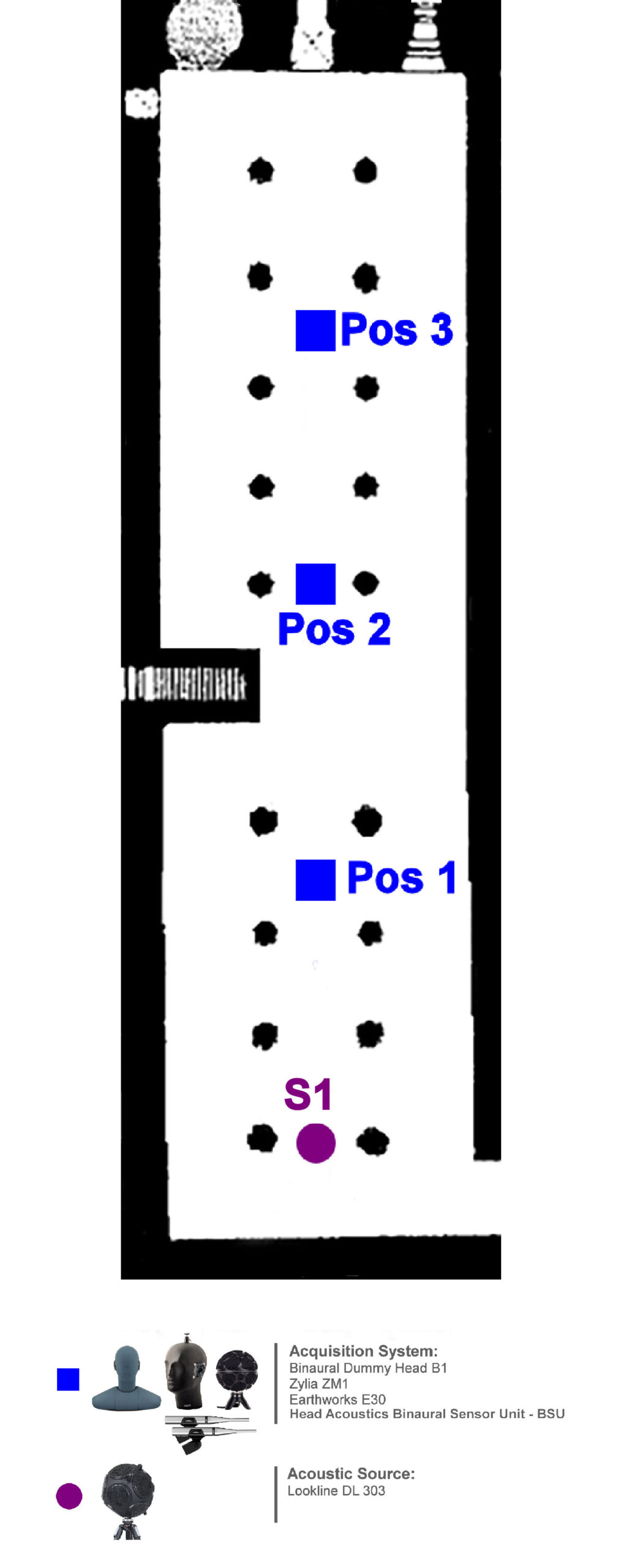 A fonte sonora foi colocada no extremo sul do Dormitório, centrada (S1). As aquisições e registos acústicos foram realizados em 3 locais, longitudinalmente, e centrados, a várias distâncias da fonte (Pos1, Pos2, Pos3).