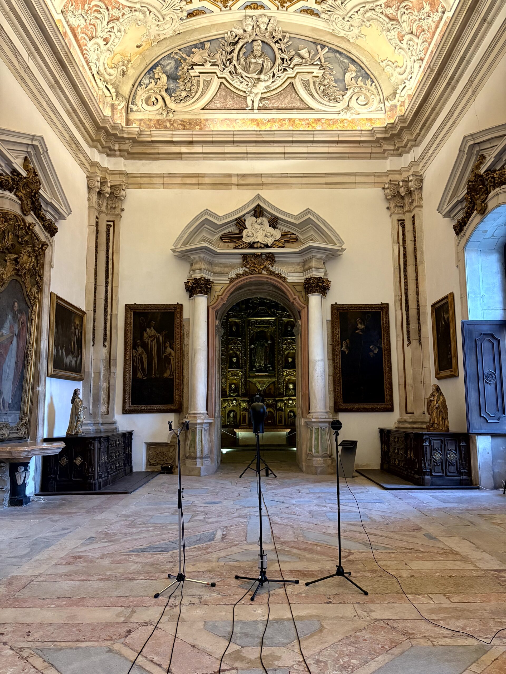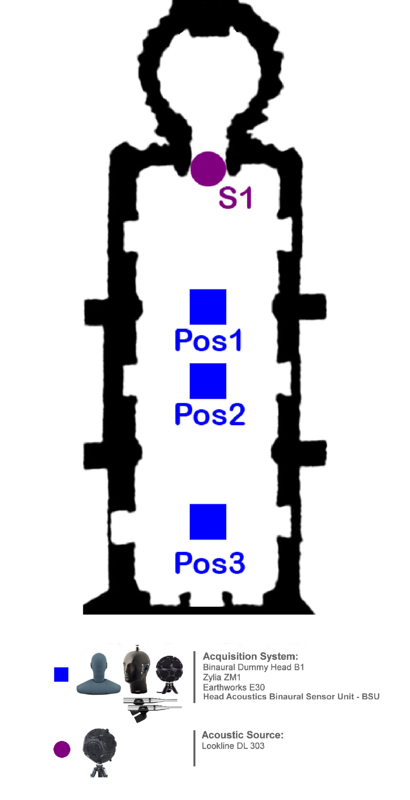 A fonte sonora foi colocada junto á entrada da Capela Relicário (S1), numa posição centrada da Sacristia. As aquisições e registos acústicos foram realizados em 3 locais, centrados, ao longo do corpo da Sacristia (Pos1, Pos2, Pos3).