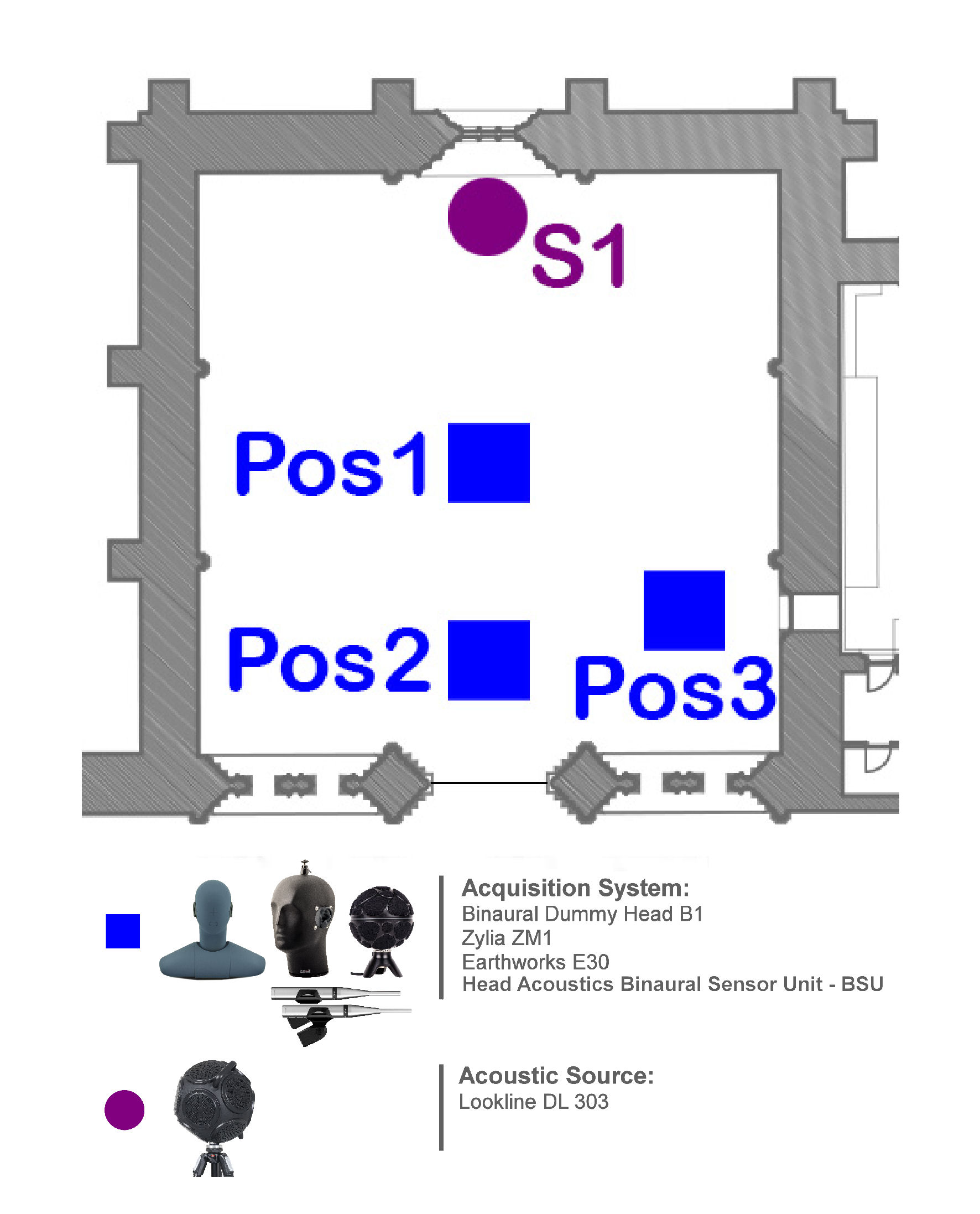 The sound source was placed near the east window (S1). Acoustic acquisitions and recordings were performed in 3 locations: the first located in the centre of the Chapter Room (Pos1), the second in an intermediate position closer to the entrance (Pos2), and the third in front of the entrance to the wine cellar (Pos3).