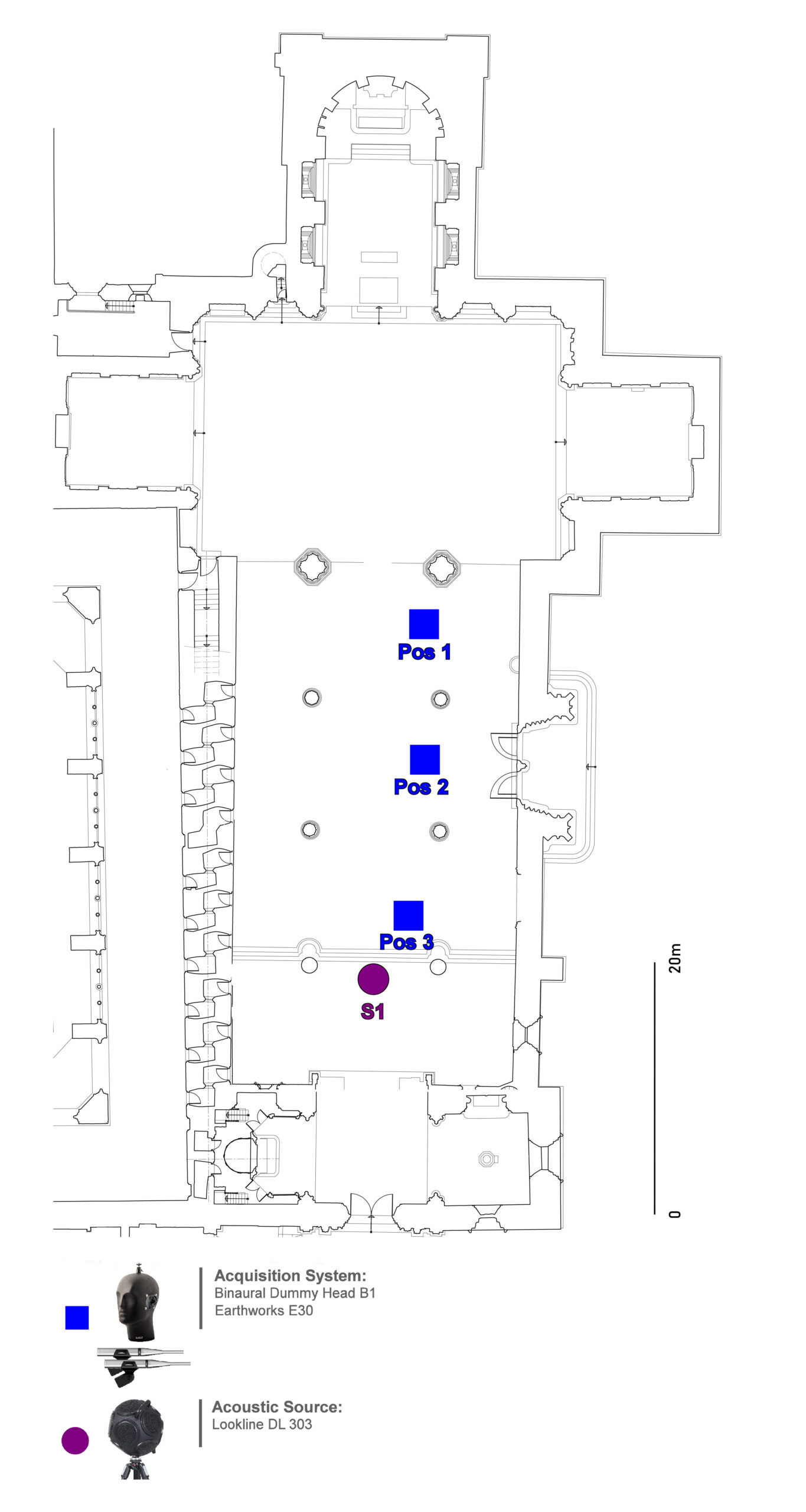 The sound source was placed in the high choir, in a centred position with the nave (S1). Acoustic acquisitions and recordings were made in 3 locations in the nave of the Church in the area intended for the faithful (Pos1, Pos2, Pos3).