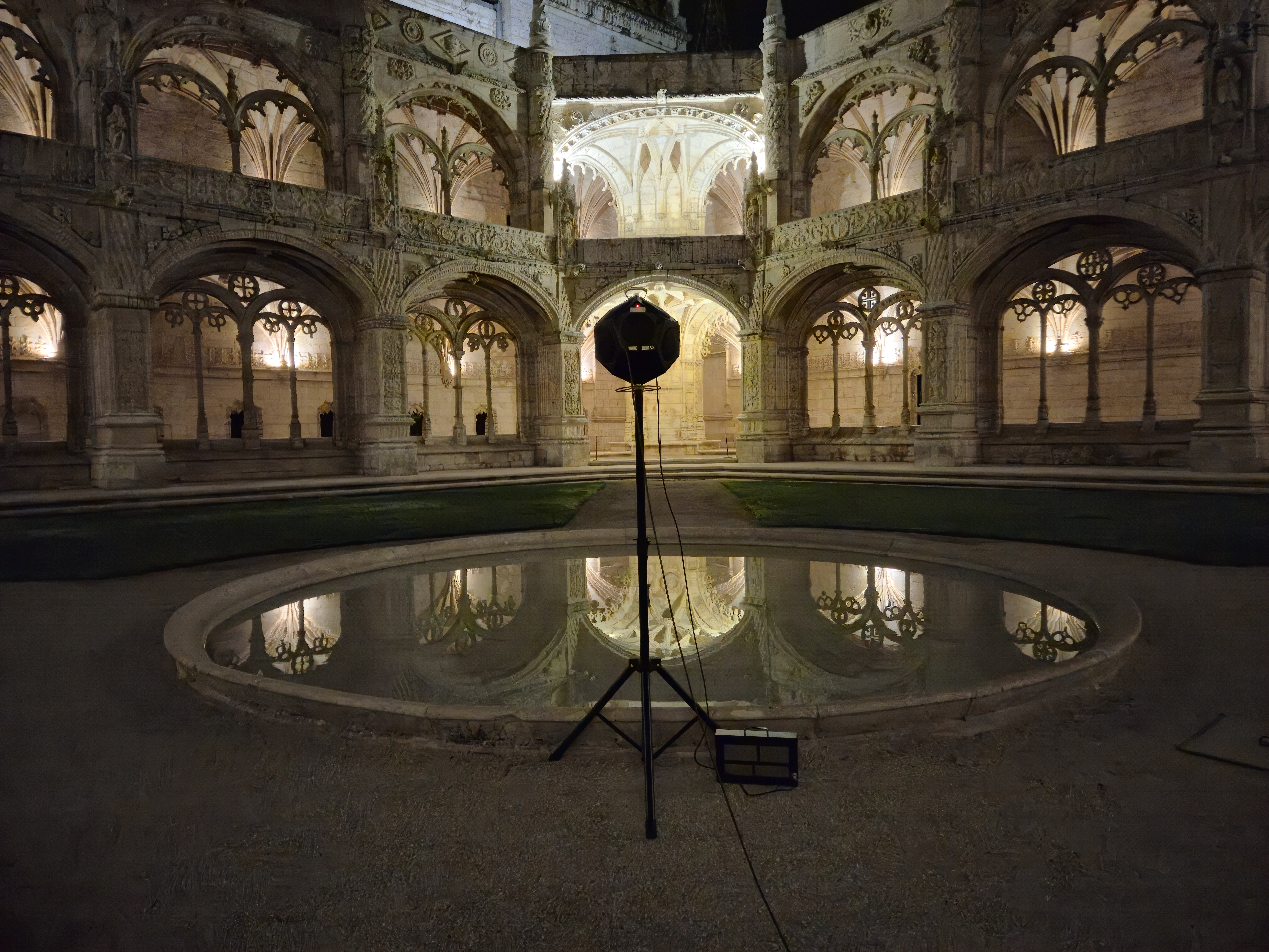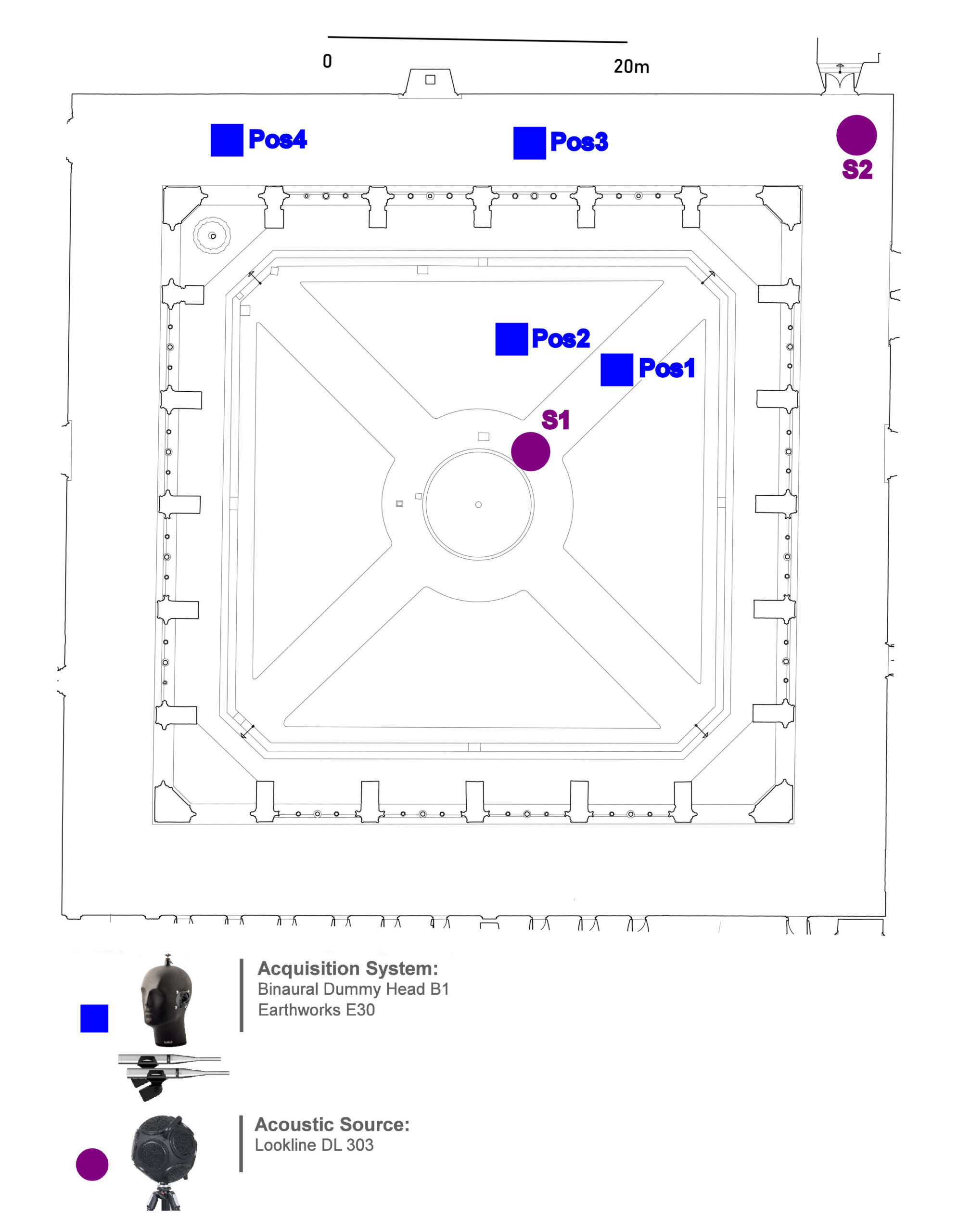 The sound source was first placed as close as possible to the central circular pond, to the northeast (S1), and secondly it was placed in the northeast corner of the Cloister galleries (S2). Acoustic acquisitions and recordings were carried out in 4 distributed locations (Pos1, Pos2, Pos3, Pos4), the first two within the inner perimeter and the other two in the north gallery of the Cloister.