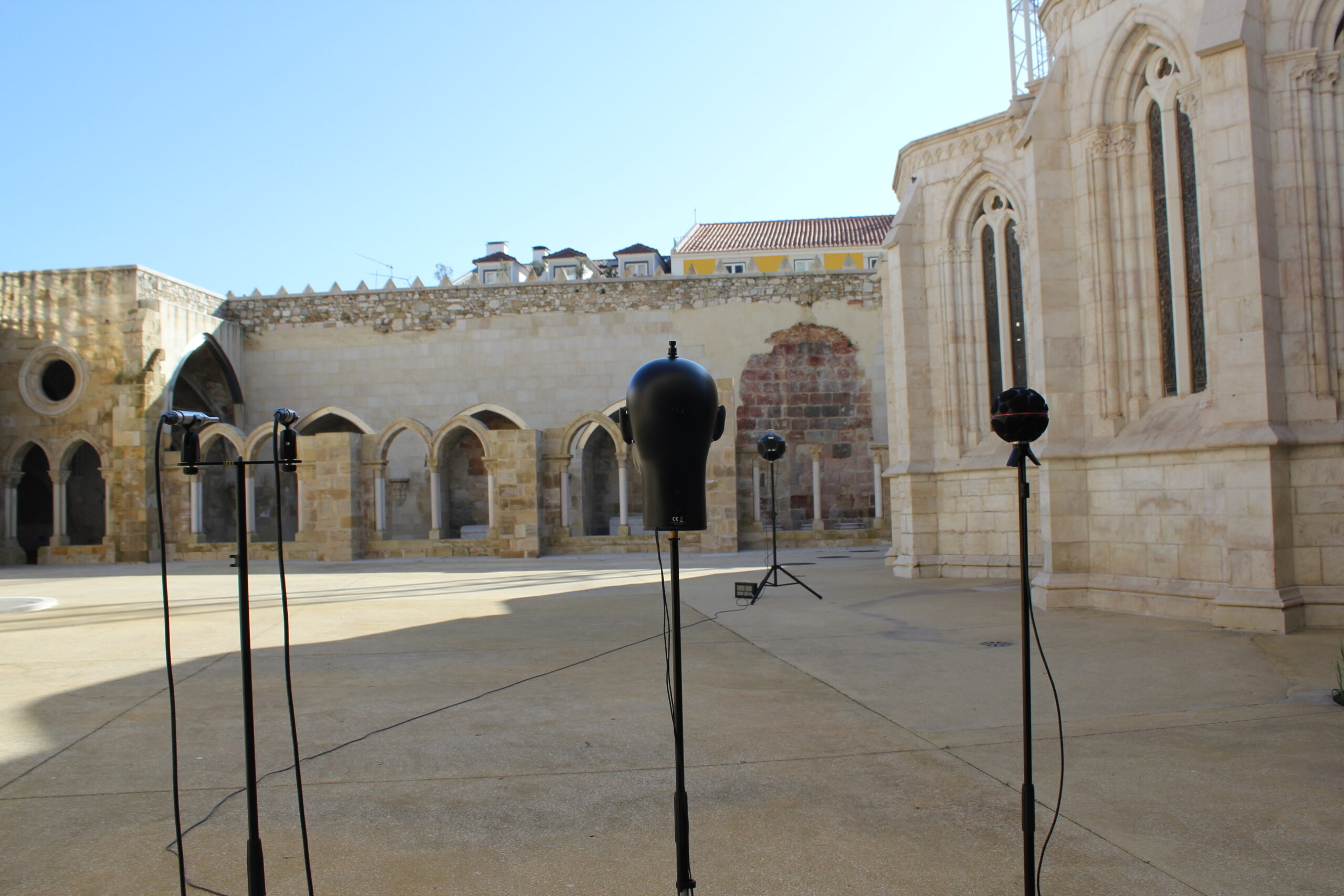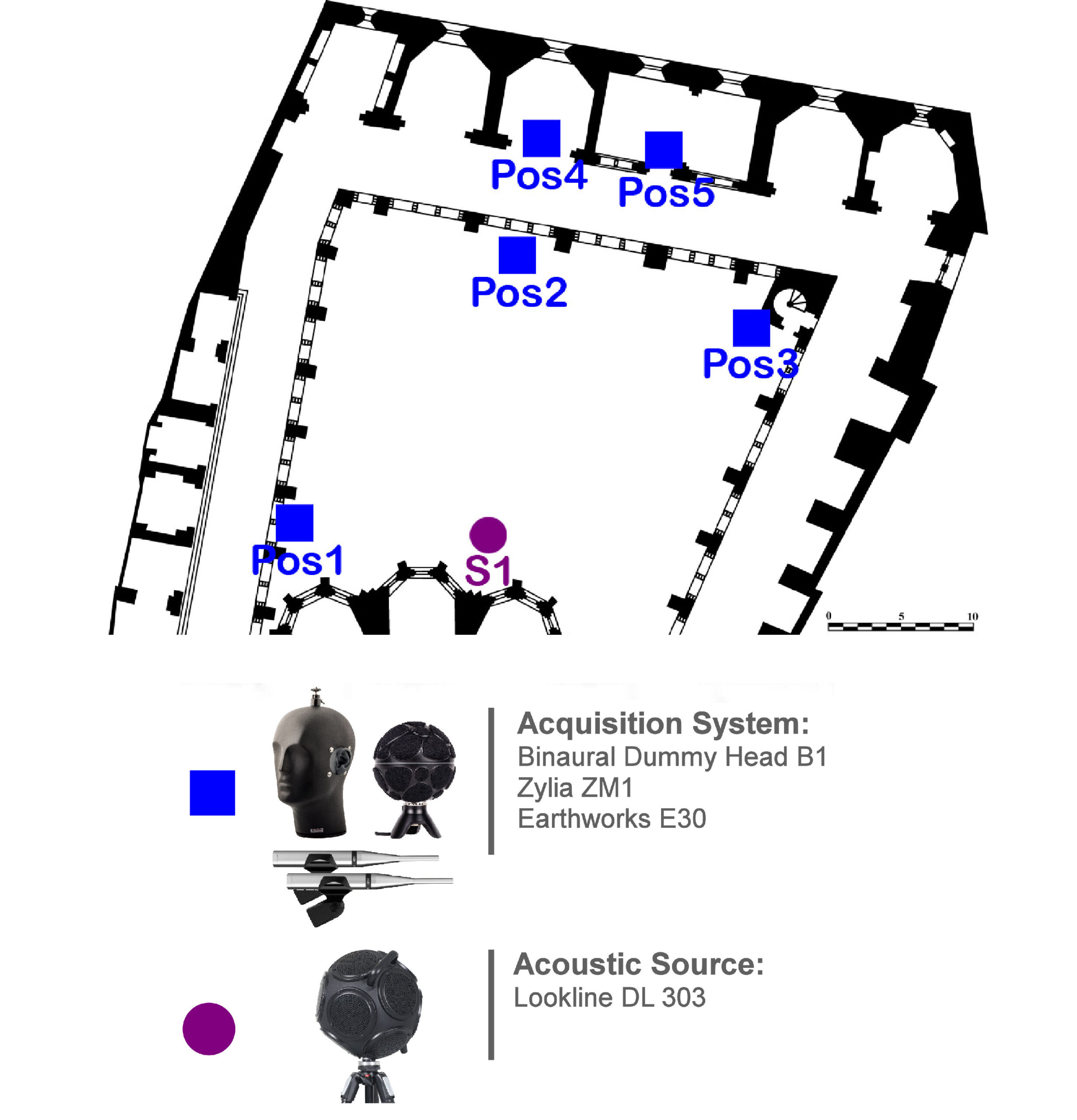 The sound source was placed next to the wall of the Cloister that delimits the deambulatory of the church (S1). The acoustic acquisitions and recordings were carried out in 5 locations, the first 3 located in the courtyard of the Cloister (Pos1, Pos2, Pos3), and the remaining 2 located respectively in the Chapels of Nossa Senhora da Piedade da Terra Solta and Santo Estevão (Pos4, Pos5), next to the east corridor.