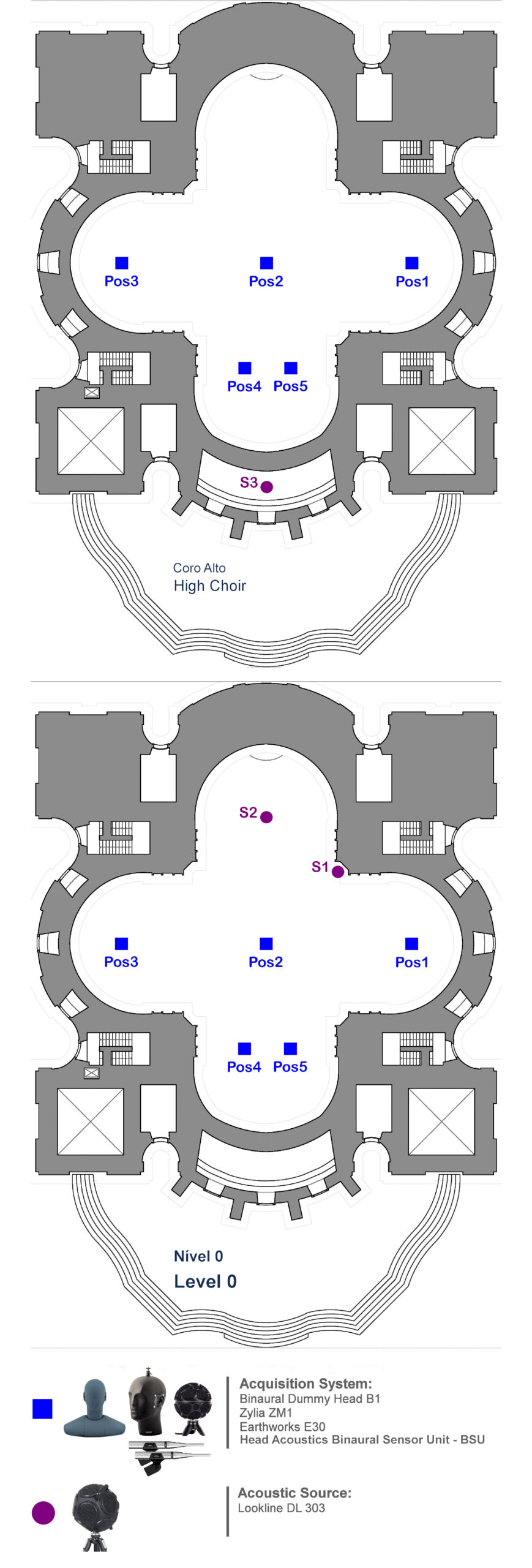 The sound source was placed in the southeast pulpit (S1), next to the high altar (S2), and in the high choir (S3). Acoustic acquisitions and recordings were made in five locations throughout the church, in the area designated for the faithful, in the nave.