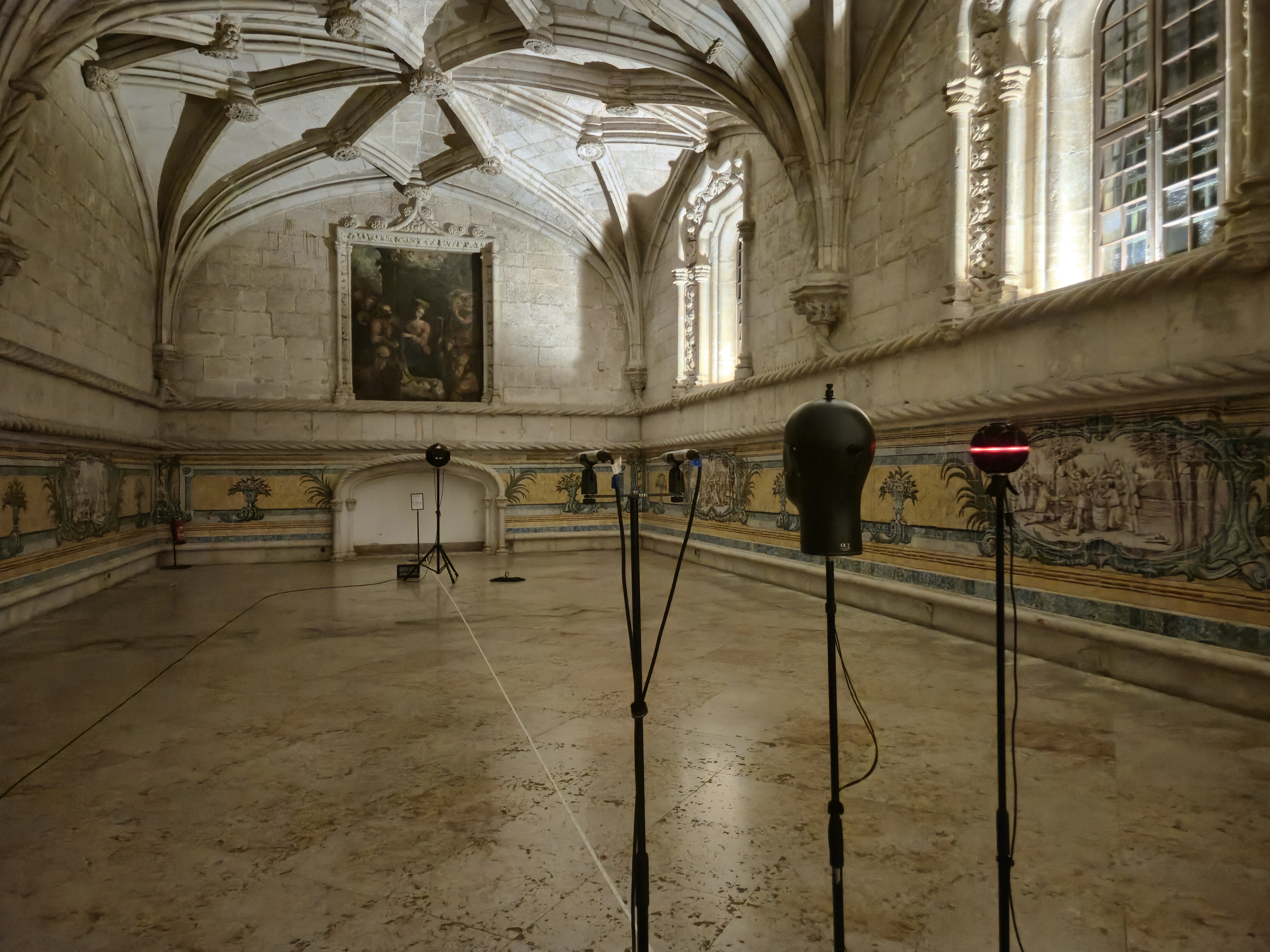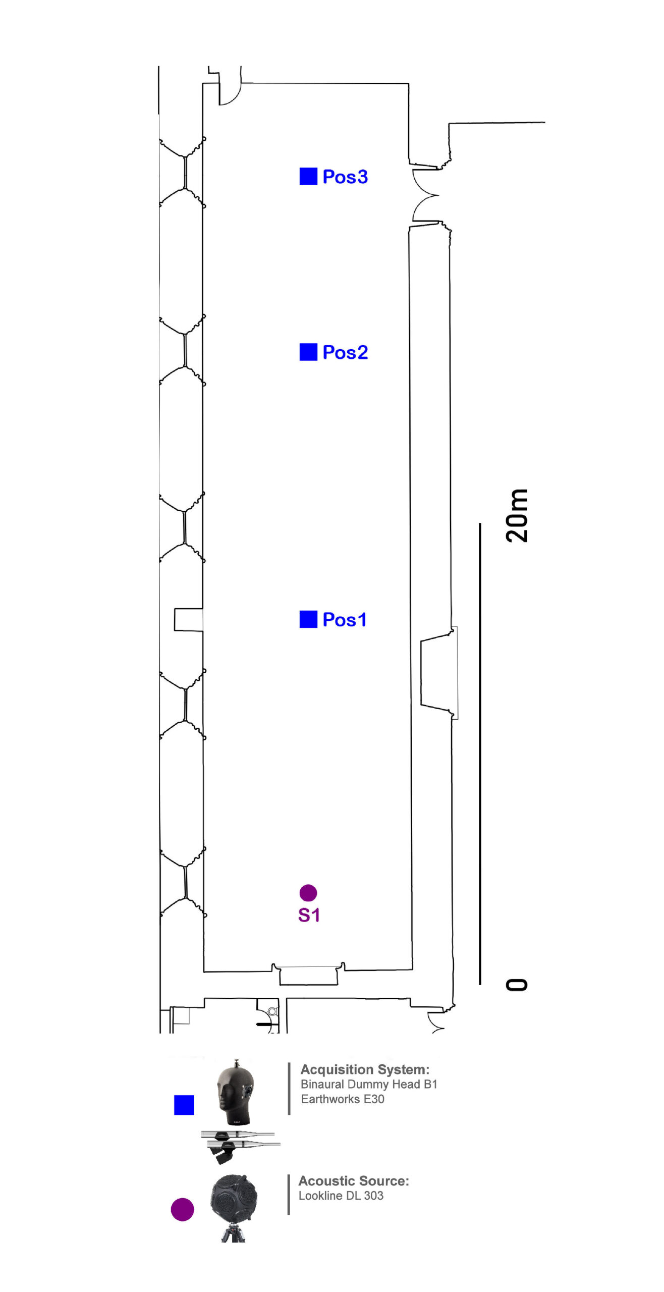 The sound source was placed near the south wall, in a centralized manner (S1). Acoustic acquisitions and recordings were carried out in 3 locations, arranged along the Refectory (Pos1, Pos2, Pos3).